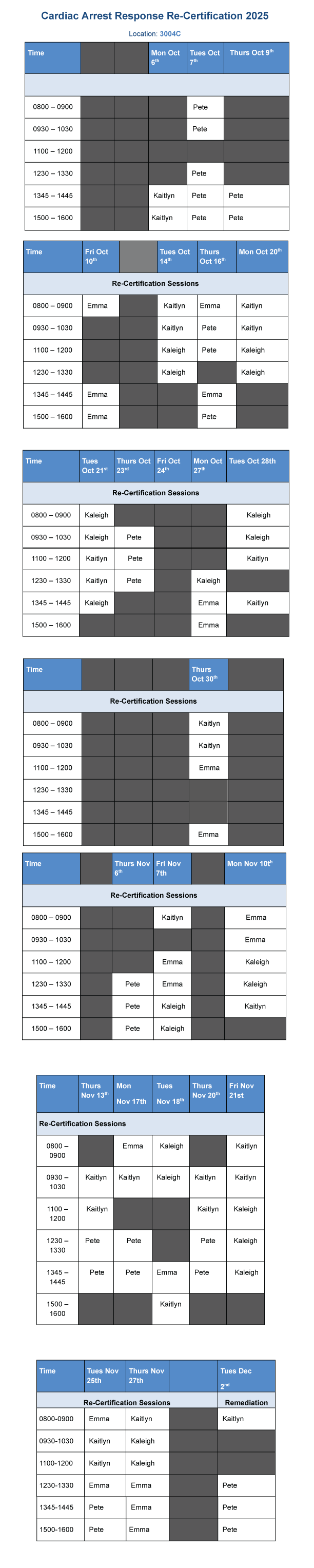 The Cardiac Arrest Response (CAR) re-certification course requires registered nurses (RNs) certified in CAR to demonstrate the delegated acts of (a) defibrillation; (b) transcutaneous pacing; (c) and administration of life-saving medications. In addition, participants are required to complete a re-certification test with a passing mark of greater than or equal to 90%.